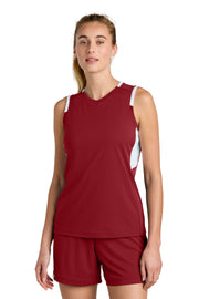 - Mesh back panel, under arm insets, and color blocked insets
